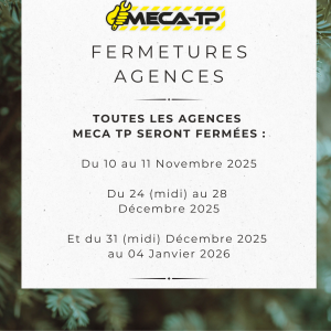 Toutes les agences MECA TP seront exceptionnellement fermées le 24/12 à midi jusqu’au 28 Décembre 2025, et le 31/12/2025 à midi jusqu’au 04 Janvier 2026. Nous vous accueillerons à...
